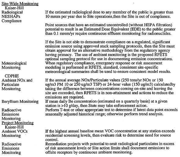 Air Quality Management operates a monitoring program that supports both compliance demonstration and emergency response needs at the Site. Monitoring of radioactive emissions from building process vents support both DOE Order requirements and radionuclide NESHAP monitoring and reporting requirements. Effluent monitoring also supports ALARA (as low as is reasonably achievable) principals. Ambient monitoring of radionuclides on the Site and in the communities immediately adjacent to the Site also satisfy DOE Order requirements and is anticipated to be used in the near future to satisfy radionuclide NESHAP reporting requirements. Meteorological monitoring supports both the radionuclide NESHAP reporting requirements and emergency response requirements under the DOE orders.