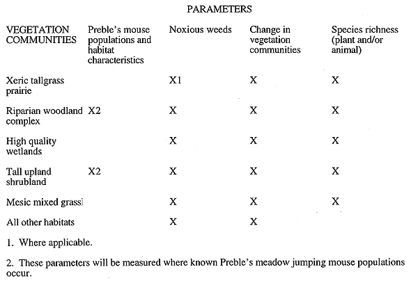 The design of the Ecological Monitoring Program follows the development of decision rules regarding conservation and regulatory compliance at RFETS. These decision rules specify the measurement and evaluation of analytical parameters for five vegetation communities and for Prebles meadow jumping mouse populations on the site. They also specify the criteria that will help ensure regulatory compliance. These criteria, if detected for any of the variables, will trigger a re-evaluation of ecological conservation actions or re-evaluation of RFETS project designs. These decision rules are formulated such that each can independently trigger an action. Key parameters to be measured and used in comparisons are presented in Table II.