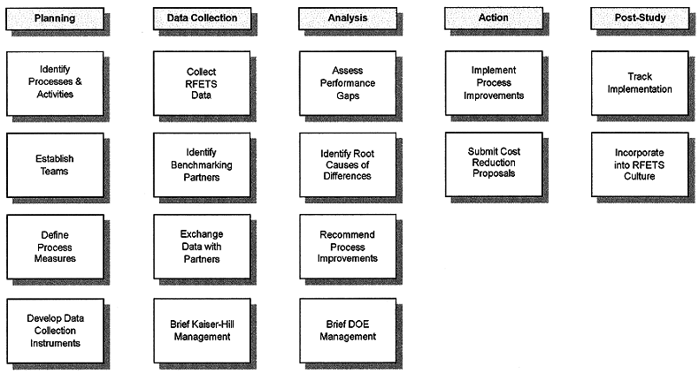 The specific activities pursued during each step in the Rocky Flats benchmarking model are described below. Emphasis was consistently placed on the fact that benchmarking historically has been most effective when performed by the process owners themselves. To this end, the Kaiser-Hill benchmarking team served only to facilitate the process improvement activities, to maintain focus on the benchmarking objectives, and to provide status briefings to the managers and sponsors of the benchmarking initiative.