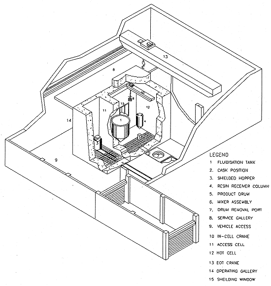 The plant layout is given in Fig.1. It has been worked out keeping in view segregation of active & inactive areas, man & material movement and remotised maintenance requirement. It consists of a hot cell, an access cell and services & operation galleries. Cells are in the high bay area of WMP. The hot cell has internal dimensions of 5m x 4m x 9m and has a port of 2m x 2m below ground for product removal. The cell is designed to handle radiation levels up to 10 Sv/hr and is equipped with remotisation gadgets like MSM, in-cell crane & shielding window. All active equipment like spent resin receiver column, fluidisation tank, drum handling trolley, etc. are housed here. The access cell is adjacent to the hot cell and is meant for handling shielded resin hoppers and their hook up to the main system. A 20 Te EOT crane and a 10 Te motorised trolley are provided in the hot cell bay. The services gallery, provided on top of the cells, also houses the chemical feeding system. Various controls and manipulators are located in the operating gallery which is provided around the cell at ground floor level.