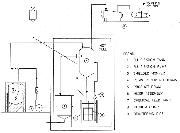 A step of air drying of resin in the resin receiver column was included in the original scheme. Initial trial runs revealed that smooth draining of dried resin from the receiver column was often impeded in spite of the magnetic vibrators provided. This is probably due to the low flow air drying system employed for the deep packed resin bed which resulted in surface moist resins. Prolonged drying with reversal of air flow could solve this problem, but such a measure was considered unacceptable for routine active operation. Draining of wet resin under hydraulic head was tried which operated very smoothly. Draining of IX resin in slurry form was therefore adopted for transfer of resin from the resin receiver column to the product drum. Pre- treatment of the IX resins by in-drum air drying was found difficult for adoption as a back fit. As an alternative, in- drum vacuum dewatering of IX resins was tried out and found to be quite feasible. Vacuum dewatering trials showed that a residual moisture of 5 to 10% remained with the resin as surface water in addition to the inherent bead water of about 50%. Polymerisation studies were conducted with resins having various degrees of surface water on lab scale and it was found that moisture up to 15% as surface water could be tolerated with marginal adjustments in proportion of chemicals. It was also noticed that the quality of the product was not affected by presence of surface water in the IX resin. In fact, it helped to some extent, in slowing down the reaction rate and limiting the peak exotherm. The in-drum vacuum dewatering system, with a single resin trap in a standard flat bottom drum, was modified into an inverted dished bottom with an extended ring header to avoid free water retention after the vacuum in broken. The operational flow sheet currentlyadopted incorporating vacuum dewatering of spent resin is given in Fig.2.