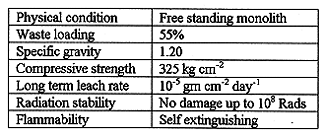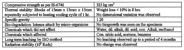 Studies were concentrated on organic matrices for the conditioning of spent IX resin which included binders like bitumen, PVC, HDPE & polyesters. After preliminary laboratory evaluation, an isophthalic grade polyester resin was selected for detailed investigation. This matrix is widely used in chemical industry as a protective coating for tanks, pipes etc. The polymerization reaction is initiated with a catalyst/ accelerator combination of methyl ethyl ketone peroxide (MEKP)/cobalt octoate (Cobalt). Detailed laboratory studies culminated in the choice of a process for obtaining a satisfactory waste form, capable of incorporating spent IX resin up to 55 wt%. Table II gives characteristics of polymerized products from laboratory studies.