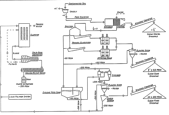 The preliminary flowsheet is formulated solely on the basis of the available technical data, focusing on the design of processing circuits that offer the best overall performance in terms of separation efficiency. In the second stage of the flowsheet design process, a revised flowsheet is again developed to address economic factors. Unitoperations and/or processing strategies that are not cost effective are redesigned and/or replaced by more economical alternatives that might be, however, less efficient in terms of technical performance. Finally, the revised flowsheet design is reevaluated in light of secondary considerations important to the successful implementation of the proposed soil treatment facility. At a minimum, these include those related to maintenance, operation, control, long-term performance, public acceptance of each of the selected processing circuits. If necessary, additional modifications to the flowsheet are implemented to accommodate these secondary considerations. The impact of these final modifications on plant performance and cost are evaluated and, if acceptable, are incorporated into the final design of the semiworks conceptual flowsheet. In addition, the conceptual flowsheets incorporate features and/or provisions that meet or exceed all applicable federal, state, and local regulations to ensure operational safety and minimize potential hazards to the environment. This iterative process is a combination of characterization studies, treatability studies, and process design. The process describes the best approach to achieve the most technically and economically feasible process design.