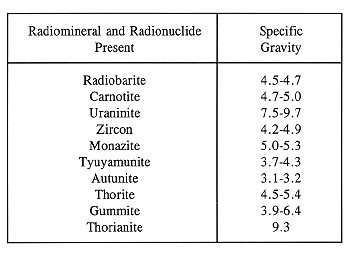 In additional to sieving, other separation procedures are often important to characterization studies. Radioactive minerals typically have specific gravities greater than soil materials. Table I provides a list of the specific gravities of radioactive minerals that might be found in contaminated soils. For comparison, the specific gravity of common quartz sand is typically 2.65. With the exception of amorphous silica, the specific gravities of the radiominerals listed are all substantially higher than most of the materials found in the host soil. Therefore, radioactive minerals might be amenable to density-based separations. The only particles that might be lost using this process are those of the relatively small weight-fraction of noncontaminated heavy-minerals, which will also separate with the contaminated particles. The magnetic susceptibility of several radiominerals also suggests a physical separation option for volume reduction by contaminant removal.