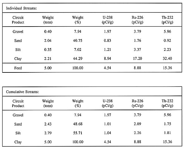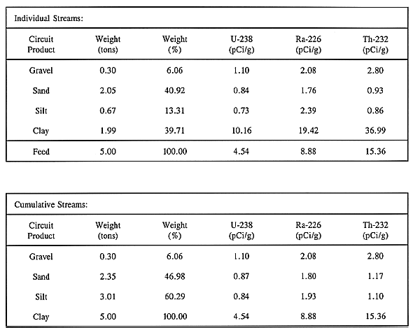 An example of a computer simulation for the flowsheet shown in Fig. 1 is presented in Tables II and III. The flowsheet design is based on characterization data provided in a report on radionuclide contamination at a remediation site under study (9). From Table II, the weight (mass) reduction of a perfect separation of the flowsheet is shown as 60.3 percent, with activity levels of 0.84 pCi/g U-238, 1.93 pCi/g Ra-226, and 1.10 pCi/g Th-232 in the cleaned product. (The densities of feed material and product streams are surprisingly similar since the soil particles are more loosely packed in product streams than they are in natural soil. Weight and volume percentages agree, therefore, within a several percentage points, and the term "volume reduction" is often used for weight reduction in the discipline. Caution in using these terms is necessary, since the difference can be important, especially in economic comparisons.) From Table III, the weight reduction of an optimum separation of the flowsheet is shown as 55.7 percent, with activity levels of 1.04 pCi/g U-238, 2.26 pCi/g Ra-226, and 1.81 pCi/g Th-232. This flowsheet is capable, with perfect separations at each unit operation, of achieving a 60.3 percent weight reduction below the cleanup criteria. However, based on operating parameters and misplaced material, the actual weight reduction of this flowsheet is 55.7 percent. The overall recovery of "clean" soil is 92.4 percent for this flowsheet design (actual weight/perfect weight reduction). These results represent a very efficient flowsheet design that would be a strong candidate for a treatment process. Economic consideration based on past experience and the literature (10), indicates that this level of weight reduction is extremely competitive with alternate remediation processes such as disposal alone.