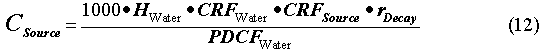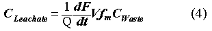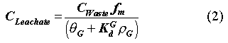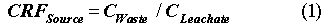 where CWaste is the concentration in the waste form for each radionuclide averaged over the entire volume of waste in the disposal facility (µCi/L), and CLeachate is the corresponding concentration in the leachate for each radionuclide as it exits the bottom of the disposal facility (µCi/L).