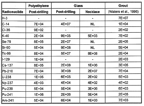 The relative performance of polyethylene to grout depends on the specific radionuclide evaluated, as shown in Table IV. For Cl-36 and K-40, polyethylene performs approximately 2 orders of magnitude better than grout. For U-238 and Np-237, grout performs better than polyethylene. The relative performance of glass is also dependent on the selected radionuclide. For K-40, Se-79, and Tc-99, glass performs 3 to 4 orders of magnitude better than grout. For U-238, Np-237, and Pu-239, glass performs 1 to 2 orders of magnitude better than grout. No value was presented for H-3, Cl-36, and I-129 in glass and H-3 in glass because the high-temperature processes will volatilize these elements.