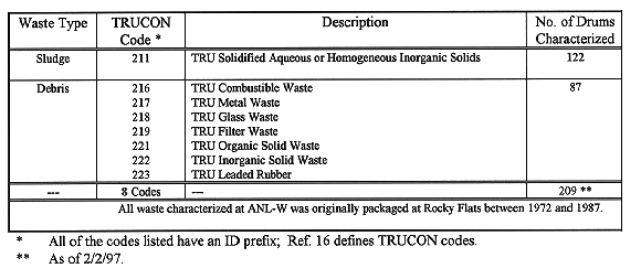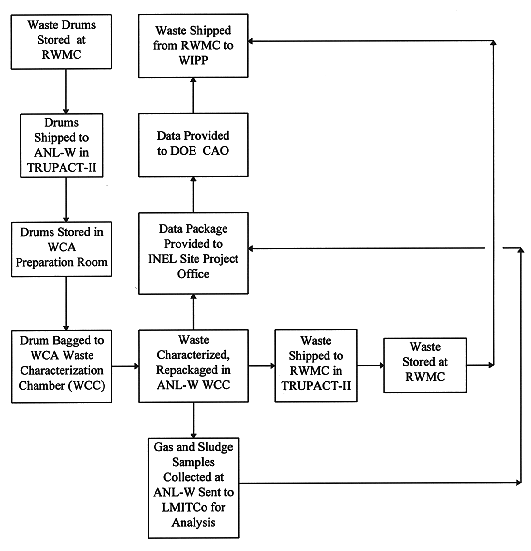 Characterization methods are delineated in DOE's TWCP Methods Manual (12). The methods applicable to Argonne's current role in characterization are headspace gas analysis, sludge sampling, and visual examination. Following characterization at the WCA, drums are repackaged to meet shipping requirements and returned to the RWMC where they are stored until their eventual shipment to WIPP. The characterization results presented in a later section of this paper focus on the activities performed at ANL-W.