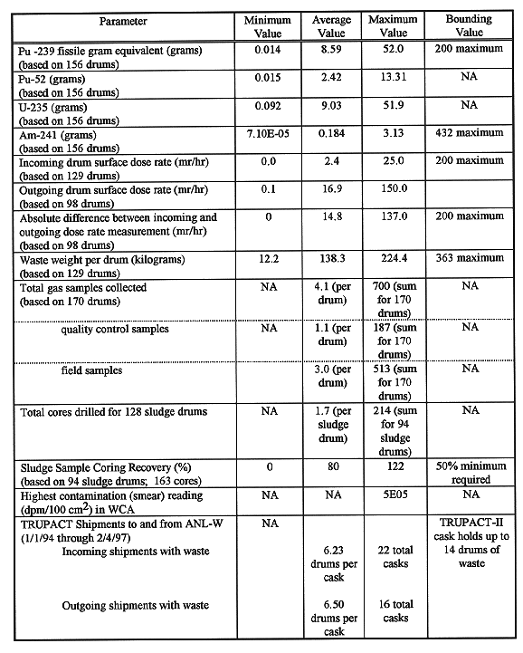 A total of 209 drums were characterized at ANL-W between 1991, when the program was initiated, through February 2, 1997. Table I shows the waste categories and the number of drums in each category. All of the waste characterized was originally packaged at Rocky Flats between 1972 and 1987. Table II provides a summary of various radiological, programmatic, and operational parameters, along with bounding values for comparison. The next section presents some conclusions from the results.