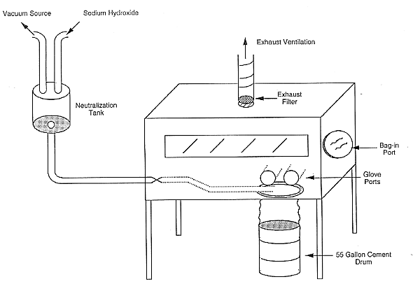 Grouting powders are pre-mixed in accordance with a specified formula and placed in a 55-gallon drum that is then attached to the bottom of the glovebox using a plastic liner-bag. A pre-determined number of 4-liter plastic bottles with waste solutions are transferred into the glovebox through the bag-in port. The liquids are vacuum transferred from the bottles into the neutralization tank, where sodium hydroxide is added, as necessary, to adjust the pH into the basic range. The liquid is then gravity drained from the neutralization tank back into the glovebox where it is poured into the grouting drum. The liquids are mixed into the grouting powders by an operator manipulating a rodding stick through gloveports on the side of the glovebox. If sampling of the wasteform is required, a sample of the wetted cement is obtained and packaged for shipment to the analytical laboratory. After a specified preliminary curing period, the cement waste drum is removed from the glovebox and moved to a storage area for final curing of the cement.