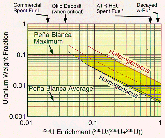 Only two of the potential waste forms can yield HEU: HEU spent fuel; and weapons-grade plutonium immobilized in glass or ceramic, after the 239Pu decays to 235U. Natural uranium ore deposits provide evidence for the configurations HEU might take, if it were to precipitate below a repository. For example, in the Peña Blanca uranium deposit in Mexico, pitchblende (UO2+x) is found in fault zones in fractured tuff as coatings, veinlets, stringers and disseminations. In deposits of this type, average uranium weight fractions can be 0.3 percent, reaching 10 percent locally (13). Figure 1 shows that these concentrations would be sufficient to reach criticality in infinite, homogeneous systems (kinf = 1) for uranium with enrichment greater than roughly 4%. For finite systems, neutron leakage somewhat increases the critical concentration of HEU.