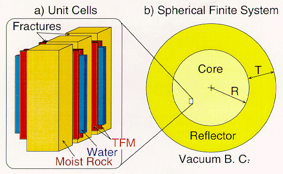 For the neutronics analysis presented here, geohydrologic transport processes were assumed to carry TFM from multiple canisters and deposit it in rock fractures as shown in Fig. 2 and as elaborated upon in the next section. Static calculations were performed for plutonium dioxide and uranium dioxide in Nevada tuff. TFM deposition are assumed to occur on surfaces of rock fractures, which are planar and parallel and equally spaced with each other. Water flows through fractures, and fills partially the void spaces of the rock matrix surrounding fractures. We have made a parametric study for the thickness of the TFM deposition layer, the fracture aperture, the fracture spacing, the TFM enrichment, and the water saturation in the rock matrix. Here we report on a limited subset of the cases considered, all pertaining to 239Pu. This almost 100% 239Pu is what will become of the weapons plutonium after few 6760 years half-lives of 240Pu. Information on effects of higher concentrations of 240Pu and on properties of HEU - tuff systems can be found, along with details of the assumptions made and results obtained in Refs. 5, 9 and 10. Specific goals of the neutronic parametric study included finding: a) the critical mass of heterogeneous depositions of TFM in tuff; b) the value of six reactivity-feedback mechanisms: water removal, TFM-temperature increase, rock-temperature increase, homogenization of TFM and rock, buildup of fission and transmutation products, and expansion; and c) identification of a scenario for an autocatalytic prompt super critical chain reaction.
