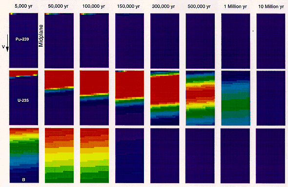 The absence of long-range Pu migration is also supported by detailed diffusion-advection-sorption analysis of transport in a dual porosity system consisting of fractures and matrix porosity (8). Figure 3 illustrates the evolution of concentrations of 239Pu, 235U, and boron. In each rectangle, the fracture is located on the left vertical side. The right side represents the mid plane between two adjacent fractures. The vertical and dimensions are 200 m and 0.37 m, respectively. Water is assumed to flow in the fracture (the left side). Radionuiclides are transported by advection through the fracture, while diffusing into the rock matrix by molecular diffusion. Radionuclide movement my advection and molecular diffusion is retarded by sorption equilibrium between the solution phase and the solid phase.
