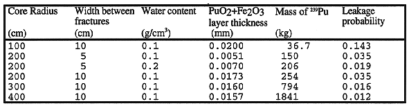 Table 1 gives the 239Pu mass and core volume of a number of configurations of 100% 239Pu and tuff. The cores of all these configurations is assumed to be spherical and to be surrounded by an infinite reflector of tuff. Each spherical core actually represents a large family of core geometries having the same neutron leakage probability. The TFM deposition is assumed to consist of PuO2 + Fe2O3 at 1:1 molecular ratio, 7.96 g/cm3 in density. The tuff density is 2.20 g/cm3. We selected the 2 m in radius spherical core having 254 kg 239Pu critical mass as the reference system for more detailed analysis. All the results that follow pertain to this system.