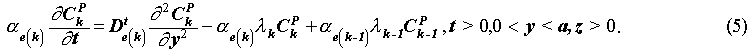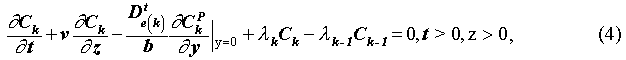 The governing equations for the concentrations Ck(z,t) in the fracture, which is needed in the solution of Eq. (1) and (2), and Ckp(y,t;z) in the pores of the rock matrix are, given by the coupled equations,