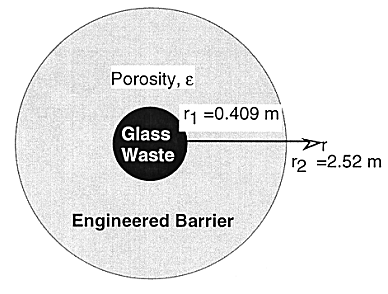 The EBS is simplified as a single uniform porous medium, whose physical and chemical properties are represented by those of bentonite. We transform the cylindrical waste solid and bentonite region to a sphere that has the same interfacial areas. Bentonite is expected to have a hydraulic conductivity more than three orders of magnitude smaller than that of the surrounding host rock (3). Therefore, it is assumed that radionuclides are transported by molecular diffusion through the stationary water in the bentonite pores. It is assumed that the diffusive mass transport in the bentonite region has no angular dependency.