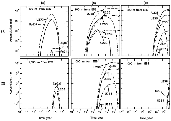 Suppose that the accumulation occur 10 m away from the edge of the repository area. From the comparison of Fig. 2 (a-2) with (a-1), the contribution from a glass log located at a distance greater 1000 m from the accumulation point will be negligibly small. Within a circle of radius 1000 m, whose center is located at the accumulation point, only 40% of the canisters contribute the accumulation, assuming that all the canisters fail. With a circle of radius 100 m, 0.4%, or 160 failed canisters are included. From Fig. 2 (a-1), at maximum 0.01 mol of 233U is contributed from a single glass log located at 100 m from the accumulation location. Therefore, of 40,000 canisters in the repository, 160 failed glass logs within the 100 m radius can actually contribute, and only 2 moles of pure 233U is expected to accumulate.