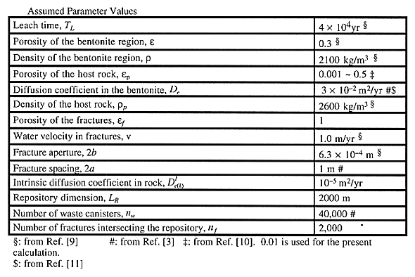 Engineered barriers around the cylindrical waste canister, consisting of a thick carbon-steel overpack and a bentonite-filled buffer region, is simplified as a homogeneous porous layer in this study. Furthermore, the original cylindrical geometry is transformed to a spherical geometry with equal interfacial areas. The waste canister and barrier dimensions for a sphericalgeometry are given in Fig. 1. The lifetime of an overpack is conservatively assumed to be 1,000 years (3). In the early stage of the first 1,000 years after the emplacement of the waste canister, the heat generation from a canister would rapidly decrease, and the temperature in the repository would settle down to the ambient temperature (~ 50°C). The bentonite buffer would be fully saturated by groundwater by then. Due to pyrite in bentonite and the carbon-steel overpack, the porewater in the engineered-barrier region will be in a reducing state. The hydrological and geochemical condition within the engineered barriers is assumed constant in time. Under the reducing environment, most actinide elements released from the glass log by alteration of glass matrix are hardly soluble, and will precipitate immediately. The bentonite will function as a filter for colloids. Presence of colloids is neglected in the analysis hereafter. Within the engineered barrier system (EBS), materials are transported as solute.