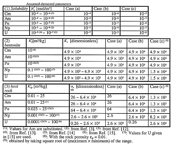 Parameter values are summarized in Tables II and III. We make calculations for three representative cases, depending on the magnitudes of the solubilities and sorption distribution coefficients of uranium isotopes and their precursors. In case a), the upper bound values of the ranges are assigned for the solubilities of Cm, Am, Pu, and Np, whereas the lower bound value is assigned for the solubility of uranium. The lower bound values of the ranges are assigned for the sorption distribution coefficients of Cm, Am, Pu, and Np in the bentonite and in the host rock, whereas the upper bound value is assigned for the uranium sorption distribution coefficients. With such a combination, the total mass of Cm, Am, Pu, and Np existing as solutes in the water phases in the bentonite and in the host rock can be maximized, whereas the mass of uranium in the water phases is minimized. In case b), the total mass of Cm, Am, Pu, and Np in the water phases is minimized, whereas the mass of uranium in the water phases is maximized. Case c) is the median case.