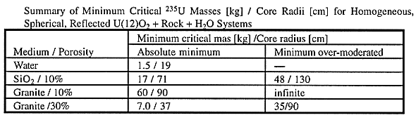 For example, the minimum critical mass is 17 kg of 235U, or 142 kg of U(12), for a spherical core consisting of uniform homogeneous mixture of U(12)O2, SiO2 with 10% porosity and water filling pores, reflected by a 120 cm thick shell of SiO2 with 0.1 g-water/cm3. The core radius for the minimum critical mass is 71 cm. For granite with porosity of 10%, the minimum critical mass is found to be 60 kg of 235U, or 480 kg of U(12). The corresponding core radius is 90 cm. The probability of accumulation of nearly half a ton of U(12) in a volume of less than 4 m3 is likely to be very small. However, the minimum critical mass for 30% porosity is as small as 7.0 kg of 235U, or 57 kg of U(12). The minimum critical mass core radius is 37 cm. This system is, however, undermoderated. The minimum critical mass in granite with 30% porosity that is not undermoderated is found to be 35 kg of 235U, i.e., 280 kg of U(12).