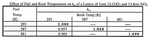 Table V shows the change in k of this initially critical heterogeneous lattice layer as a result of changing the fuel temperature and the rock temperature. For this parametric study, the initial amount of water was assumed to be retained, although during a criticality event a fraction of the water will leave the system by the time the rock temperature will reach 587 K or 881 K. It is observed that whereas changing only the fuel temperature has, as expected, a negative reactivity effect, the combined effect of rock and fuel temperature change has a positive reactivity effect (see the entries on the diagonal of Table V).