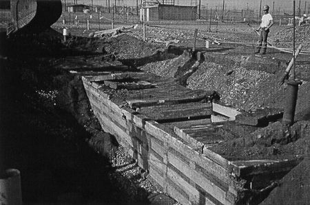 The conceptual model for the site was built based on ground penetrating survey, old photographs during operation, and process information for the B Reactor Building. The ground penetrating radar revealed an effluent pipe system at approximately 7.6 m (25 ft) below grade which conveyed effluent from the retention basins. In addition the approach used at the 116-B-4 site was applied at the 116-C-1 site. The sonic cone penetrometer and gamma logging was used to perform advanced characterization at the 116-C-1 trench to delineate the site and gain useful information for planning for contamination at depth. It was planned to evaluate the information gathered from advanced characterization against what was actually found to calibrate the approach for other investigation for future sites in the 100 Area. Figure 3 shows the excavation operation set up for the 116-C-1 site during remediation.