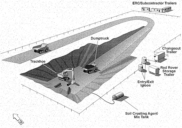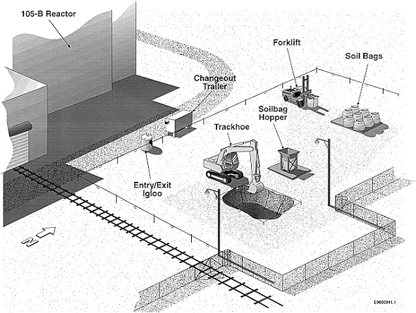 During the planning phase it was thought that the French drain consisted of a 4 foot in diameter annulus that extend to twenty feet below existing grade. The total yardage estimated for removal consisted of 30.6 m3 (40 yd3). However, after initial excavation it was determined that no engineering existed, but that native/disturbed soils were used to receive effluent. This created a larger area and depth which the effluent could move through the soil profile. This resulted in the 30.6 m3 (40 yd3) estimate to increase to an actual volume of 3,060 m3 (4,000 yd3). Figure 2 shows the site set up at the 116-B-4 site.