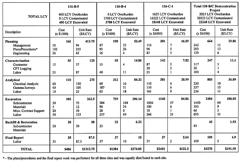 As seen in Table I, the original cost estimate per cubic yard as reported in the 100-BC-1 Focused Feasibility Study Report was $401/LCY (loose cubic yard). This estimate includes transportation and disposal. The revised MCASES model, using data from 116-C-1 fieldwork, which reduced the cost to $71/LCY (includes transportation and disposal). The actual cost seen from the demonstration project, however, shows a cost of $116/LCY (transport and disposal not included). The higher cost is believed due to the startup nature of the demonstration project. Additionally, the specifications to the subcontractor were written with more direction from the contractor than full-scale remediation would require. Full-scale remediation will experience efficiencies over the demonstration project.