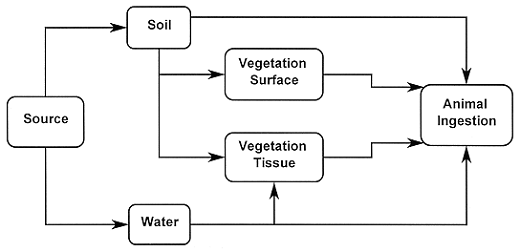 Assessment of potential ecosystem effects from exposure to DU was conducted using a steady state model for estimating exposure to radionuclides by cattle (NCRP, 1984). We modified the cattle model in order to estimate the DU exposure by white-tailed deer, although the model does not account for physiological modifications to absorbed doses such as biological residence time of DU.