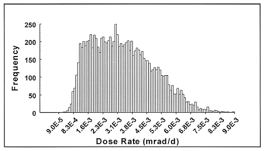 Table I shows the distribution of dose rates predicted from the input distributions, and Fig. 3 shows the distribution of the predicted dose rates for one set of simulations (see Ebinger and Hansen, 1996b, for all input and output distributions). Although the dose rate distributions varied in form and in selected statistical measures for each simulation (Table I), the largest dose rates were well below levels of concern for possible reproductive effects on deer (IAEA, 1992). Radiological dose rates were transformed to toxicological doses by converting the activity concentration that was ingested into a mass concentration using the specific activity of DU of 0.37 pCi/µg. The highest toxicological dose to deer was about two orders of magnitude lower than the threshold for nephrotoxicity in various organisms of 1 mg-U/g-kidney (Wrenn et al, 1985; Yuile, 1973; Zhao and Zhao, 1990). The tissue concentrations of DU predicted with the steady state model agreed well with the tissue concentrations of U in white-tailed deer harvested at the Aberdeen Proving Ground (Ebinger et al, 1996), and provide indirect support of the low radiological and toxicological doses to deer at JPG.