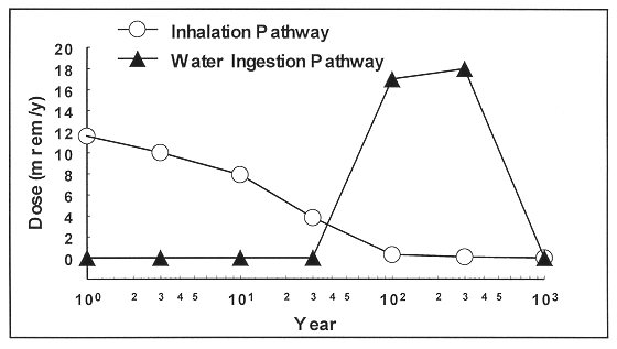 RESRAD results for each scenario are summarized in Table 2 and shown in Fig. 4 for Farming Scenario #2 (see Ebinger and Hansen, 1996b, for complete RESRAD results). Results from the Occasional Use Scenario suggest that minimal dose to humans occurs as a result of visiting the site for two 2-week periods each year. Inhalation of DU-containing dust was the largest contributor to the total dose expected as a result of occasional site use. Farming Scenario #1 results suggested that minimal dose to humans occurs when the water used for livestock is not contaminated. The dose to humans increased to about 47 mrem/y when well water contained 2 pCi/L U and was 10% of the livestock water supply, and 1987 mrem/y when 50% of the livestock water was contaminated with 2 pCi/L U. In Farming Scenario #2 and when no contaminated water was used, the first dose to humans was about 12 mrem/y and occurred at the beginning of the simulation. This initial dose was due solely to inhalation of DU-containing dust. A similar dose occurred at about 750 years into the simulation due to DU leaching through soils into the water supply wells. Doses increased dramatically when water with DU concentrations were 2 pCi/L and the percentage of contaminated water in the drinking water supply ranged from 10% to 50%.
