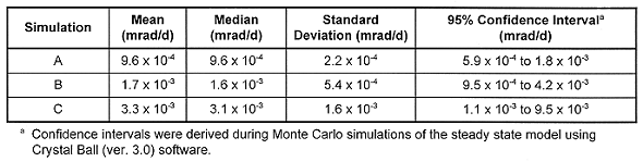The steady state model was developed to accommodate uncertainty analyses. We obtained distributions of expected values for each of the variables in the steady state model, then used these distributions in Monte Carlo simulations with the steady state model. The results of each simulation were a distribution of the predicted intake of DU by white-tailed deer. Expected values and/or confidence intervals were constructed for the predicted intake distributions, and risk of radiological damage and toxicological damage were estimated. Detailed treatment of the uncertainty analysis for the steady state model is given elsewhere (Ebinger and Hansen, 1996b).