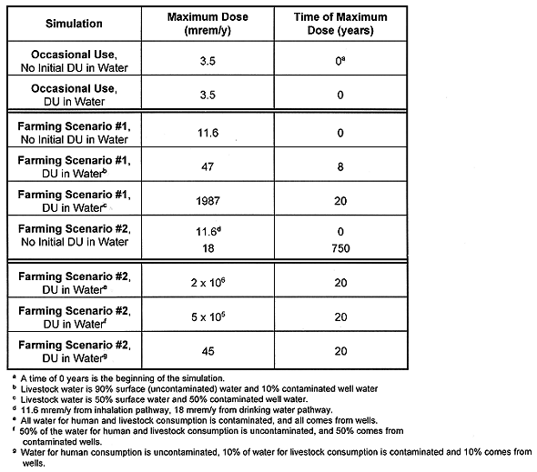 Intensive use of the affected area for farming, however, increased the predicted risk of DU exposure significantly. Increased time on the site resulted in slight increases in DU ingestion mainly through the inhalation pathway. Large increases in doses to humans occurred when: 1) meat and vegetables produced on-site are consumed by the resident farmers; and 2) residents used local groundwater that had been contaminated with DU for drinking water. As mentioned above, doses to humans increased significantly even when drinking water is uncontaminated but livestock consume contaminated water and food. Thus, intensive use of the impact area for farming is not recommended.