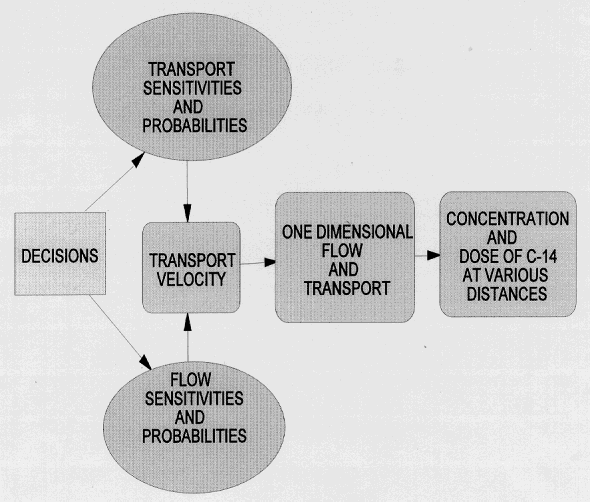 Figure 1 gives a schematic of the DPL decision model for Frenchman Flat. The rectangle represents the decisions and subjective estimates of uncertainty reduction from the panel of experts. The ovals represent the sensitivities and probabilities of values for various flow and transport parameters used with MC_TRANS. Figure 1 shows that information in the form of arrows from the rectangle and ovals goes into a calculation of one dimensional flow and transport in the first value node (rectangle with rounded corners). Note that the DPL decision model actually performs a flow and transport calculation as part of the decision analysis. This calculation uses the same sensitivities and parameter probabilities used by MC_TRANS in an analytical solution by van Genuchten and Alves (1982), the details of which are presented in the next subsection. This flow and transport calculation ultimately predicts the concentration and cumulative organ dose of carbon-14 at various distances from the source.