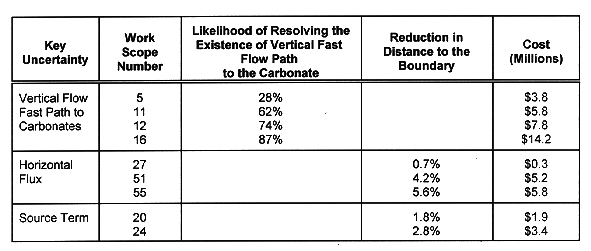Table I shows that work scopes of different costs can achieve comparable reductions in uncertainty. For example, Alternatives 12, 14, and 15 reduce uncertainty between 70 and 80 percent. However, the cost among them varies from $8 million to over $12 million. Based on cost-effectiveness, Alternatives 5, 11, or 12 give the best value for the information acquired to resolve whether vertical flux to the carbonates occurs