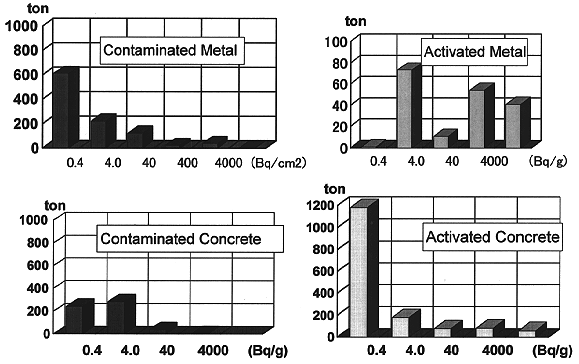 Decommissioning of nuclear facility usually generates large amount of concrete rubbles and blocks from decontamination and dismantling of buildings and structures. Though total amount is large, most of the concrete is non-contaminated (without artificial radioactivity), i.e., rubbles and blocks generated by demolition of the body of structures and/or buildings. Radioactive concrete waste are generated from decontamination of the building (usually a removal of surface layer) and demolition of activated structures around the reactor, namely from biological shield. Amount of radioactive concrete waste, however, is generally small compared to non-radioactive one. They are usually stored or disposed as low level waste, even some alternative use of low level radioactive concrete may be considered.