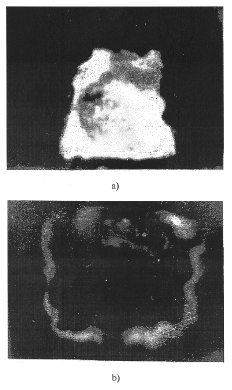 Figure 1 shows autoradiographical images of the metal surface before and after the thermosorption processing. As a result, besides decreasing the radioactivity on the metal surface, the radioactivity is also redistributed from the central zone to the periphery, which is approximately the boundary of EMC. Such a distribution of radionuclides is in agreement with the above presented ideas of the mechanism of the thermosorption decontamination of metallic surfaces.