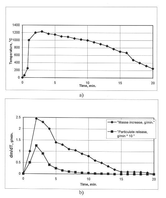 Figure 2 presents the time dependencies of the temperature of metal plates, mass rate of particulate release and the rate of EMC mass increase due to air oxygen (and, apparently, nitrogen - Table II). EMC mass was 50 g, the burning of which released