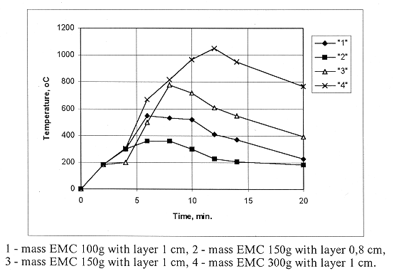 Figure 3 shows the time dependencies of the temperature of metal plates of sizes 200x200x10 mm. The junctions of thermocouples were placed in the geometric centre of plates at a distance of 1 mm from the upper surface. Temperature changes were made by changing the EMC mass burnt on the surface of metal.