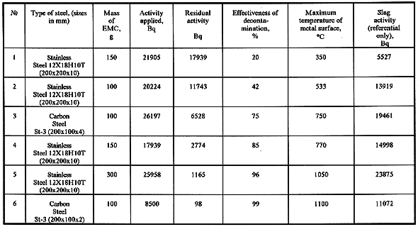 Results of a number of experiments on decontamination of metal surfaces are shown in Table I. The data show the applied and residual activity as well as the values of maximum temperatures of metal surfaces. The data on the slag activity should be considered as the reference ones, because the geometry of X-ray spectroscope specimens - metal plates and EMC slag - do not coincide.