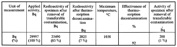 For the specimens of carbon steel which underwent chemical etching in accordance with the above presented technique, the removal of transferable contamination was carried out with the use of cotton wool gauze plugs damped in distilled water. The specimens were wiped with the plugs for several times until the radiometer (UIM2-2 apparatus) with the detection unit BDB2-01 stopped indicating radioactivity. After measuring the residual radioactivity on the specimens, they were subjected to the thermosorption decontamination. The corresponding results for one of the specimens are shown in Table II.