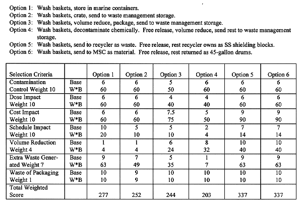 A decision matrix was used to evaluate the options for the storage and disposal of these baskets, including two proposals for the recycling of the baskets. The evaluation was based primarily upon potential for future cost avoidance, contamination, dose, cost, volume reduction, and generation of secondary wastes. Recycling at Manufacturing Sciences Corporation (MSC) was chosen as the preferred method for the disposition of the baskets.