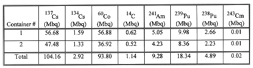 A portable gamma spectrometer was used to measure the gamma dose rate contributed by 137Cs and 60Co for each fuel basket as it was removed from the bays. This measurement was used, along with the scaling factors, to estimate the radionuclide inventory for the each of the two marine shipping containers used to ship the baskets to MSC. The results of the radionuclide inventory analysis are as follows.