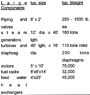 The storage of large components such as PWR steam generators and rotors from BWRs and PWRs is prevalent and routine. Domestically, we estimate that there are over 28 PWR steam generators and 35 turbine rotors in storage. The rotors weigh around 220,000 pounds each have very low levels of contamination. Steam generators, conversely, contain over 100 curies of activity on the average after a few years of decay in storage.