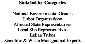 To avoid any appearance of pre-selection, the Department canvassed broadly for candidates: soliciting representative organizations from the stakeholder categories, advertising publicly, and consulting with persons and groups already working with DOE. Nominations were reviewed and scored by senior EM program managers and recommendations were made to the EM Assistant Secretary who made the final decision (5). Because of this comprehensive solicitation, evaluation and nomination process, there were few public objections to the selectees when the Department made its announcement in July 1992.
