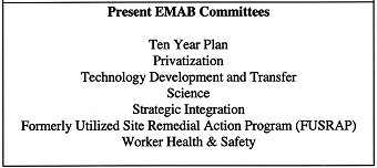 Mr. Grumbly moved swiftly to make his vision a reality. Looking to the EPA's Science Advisory Board as a model, he restructured the EMAC into an executive level, limited member EM Advisory Board or EMAB and established a committee structure reporting to the EMAB, to provide counsel on major EM issues. The Committees were to be composed of non-EMAB member specialists in various fields with EMAB members as chairs (12). He also further broadened the EMAB by naming 11 new members, including two new Co-chairs.