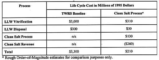 The authors wish to thank the US Department of Energy, Office of Science and Technology and Dr. Theresa Fryeberger for sponsoring this technology under the Efficient Separations and Processing program. We wish to acknowledge Dr. Dan Herting for his innovation and perseverance in developing the technology; Graham Maclean, Doug Hendrickson, Todd Lundsford and others for contributing to the development. The authors also wish to acknowledge DOEs Tanks Focus Area for supporting this study as part of Waste Policy Institute Contract No. DE-AC21-96MC33241. The clean salt process is applicable to tank wastes with high sodium nitrate content such as are found at Idaho, Oak Ridge, Hanford, and Savannah River Site.