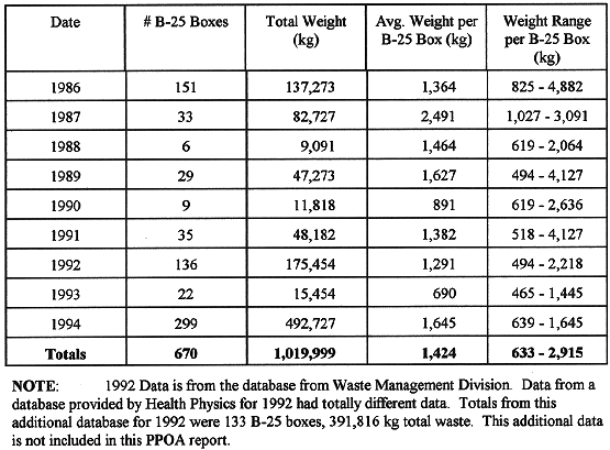 Waste data is compiled from a waste database provided by ORNL. The database includes low level radioactive soil and asphalt data for shipments dating from 1977 to 1994. This PPOA includes waste data for the period 1986 to 1994. The majority (>95%) of the material shipped for disposal was radioactive soil. Only a small portion of the material was asphalt. Changes in environmental laws and regulations have mostly occurred during this period, therefore the database for earlier years did not contain sufficient information to be included in this PPOA. Data included in Table I are totals for the specific year.