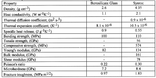 Today's knowledge permits comparing basic characteristics of borosilicate glass and Synroc ceramic matrix (see Table I). It follows from the Table that Synroc features higher mechanical properties and, what is more important, it has a better chemical durability under hydrothermal conditions and elevated pressure inclusively, compared to borosilicate glass, which makes its use more attractive. The HLW content in the final Synroc product makes up 10-20 wt.%. Its higher strength, as compared to borosilicate glass at elevated temperatures, permits increasing HLW content in the matrix, while a higher fracture toughness and heat conductivity decrease the growth of the surface area at the expense of thermal fracture.
