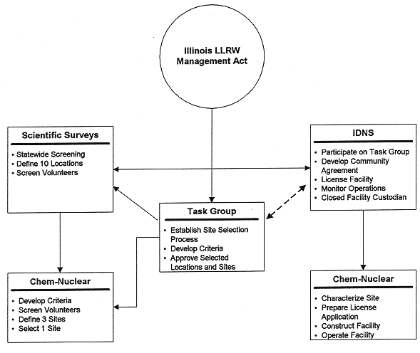 The 1993 amendments to the Illinois Management Act divided the Illinois process into two major parts: site selection and facility licensing, with the approval authority for each of these parts divided between the Illinois Task Group and the IDNS. In the Task Group's site selection part, the work is further divided into a Scientific Surveys statewide screening process and a Chem-Nuclear site selection process. The Task Group, in its report, "Site Selection Criteria for a Low-Level Radioactive Waste Disposal Facility", (December, 1996) assigns and describes its responsibilities and expectations for implementation of the various aspects of the statewide screening and site selection. Figure 1 shows these responsibilities and relationships. The Task Group's report also defines its site-selection criteria, which will be used by both the Scientific Surveys and Chem-Nuclear to determine location and site suitability.